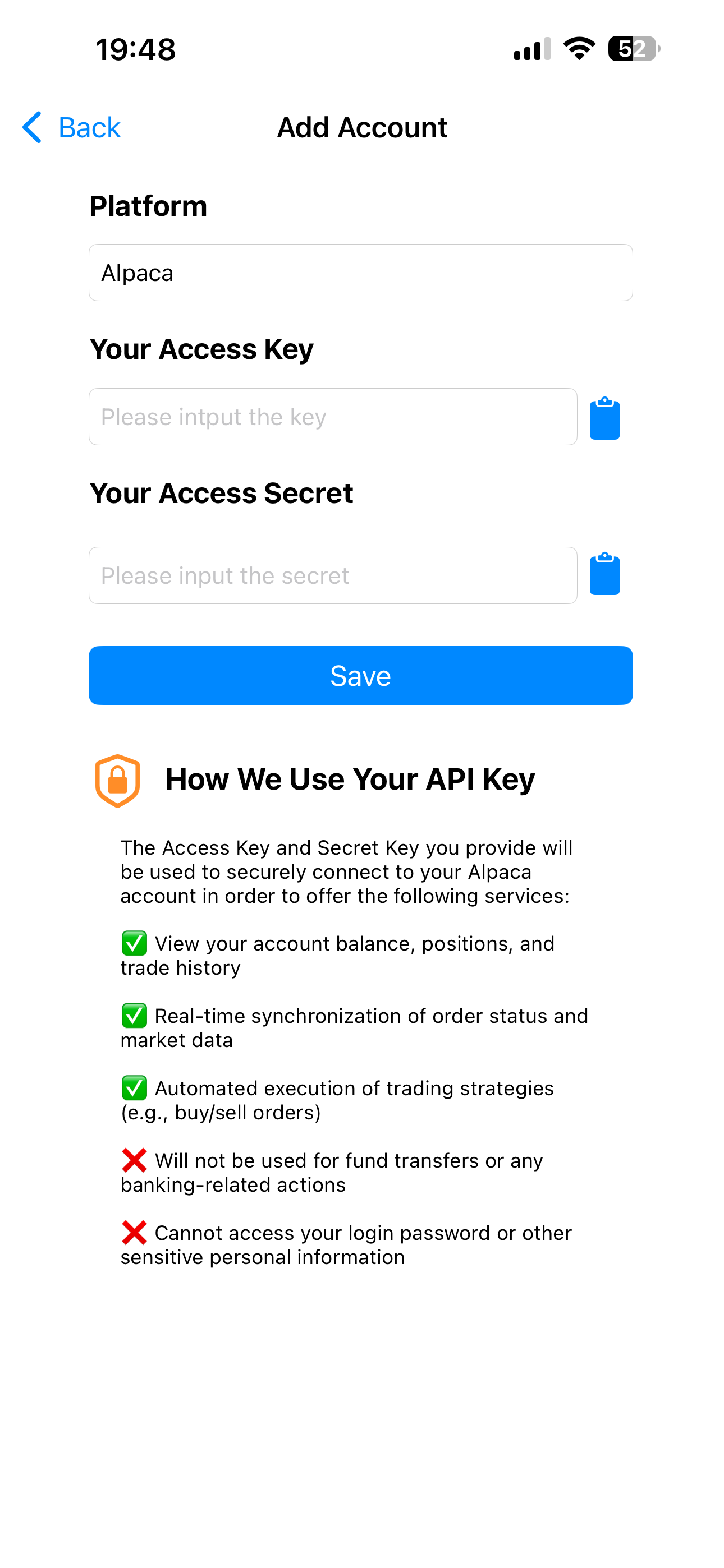 Me → Settings → Alpaca Account - Enter Access Key & Secret Key